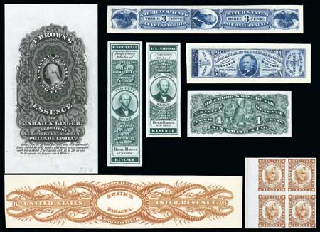 P Match & Medicine Proofs collection, collection of about 175 items including 22 large die proofs (mostly trial color), the rest are plate proofs including more than 100 pairs and nine blocks of four, F-VF throughout. An excellent starter lot with many of the die proofs being unique. Estimated Scott value is about $30,000. Estimate 10,000 - 15,000