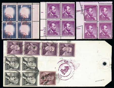 /o/ 1954 Liberty Series, small specialized group comprising 8¢ double impression (o.g., lightly hinged); 4¢ plate block with zig-zag perfs; $1 Wheaton Md. experimental booklet; $5 block of four on registered bank tag (with $1(4) & 15¢); used block of 25 of the $5, 4¢ 1961 "Postal Forgery" plate block, a 2½¢ small hole coil pair (NH); 8¢ block of four with 50% shift of center; 4¢ coil imperf pair; and 4¢ New York precancelled plate #28006, 28007 blocks of four, 7 of 8 positions (Durland $20 each). A great lot for the specialist. Estimate 600 - 800