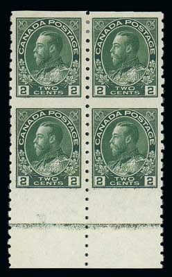 2¢ green imperf horizontally, wet printing (Unitrade 128ai), block of four with bottom sheet margin. Original gum, hinge remnant. Extremely Fine. Scott 128a var. Unitrade C$600 ($450).