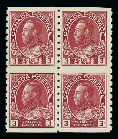 1924, 3¢ carmine, imperf horizontally (130a), block of four. Original gum, very lightly hinged. Fresh and choice Very Fine. Unitrade C$1,200 ($900). Scott $550