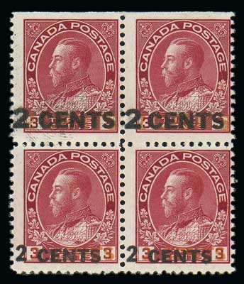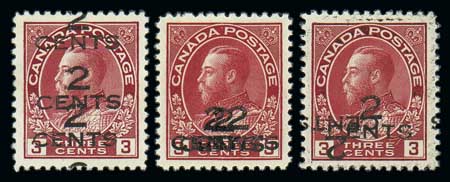 2¢ on 3¢ surcharge errors (140a-c), choice centering. 1st regummed, 2nd never hinged, 3rd lightly hinged. All fresh and Extremely Fine. Unitrade C$1,200 ($900). Scott $625