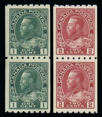 1913, 1¢-2¢ King George V "Admiral" coils complete, perf 8 horizontally (123-124), pairs. Very well centered. Original gum, never hinged. Very Fine, a choice set. Unitrade C$1,500 ($1,120). Scott $700