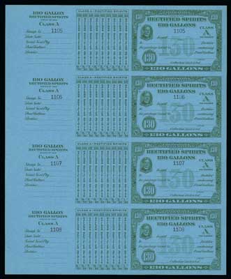 Alcohol, Bottled in Bond in Revenue Bonded Warehouse, Balance of holding comprising 24 different, mostly in full sheets as previous. Fifteen are in quantites of 122 each, seven vary between 572 and 622 of each, and there are more than 5,500 of the Distillery Bonded Warehouse sheets of 12; the latter are mostly lightly toned with occasional light toning on reverse of a few others, overall fresh and Very Fine. Estimate 2,000 - 3,000