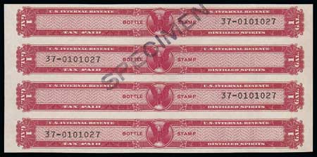 S Distilled Spirits, Bottle, Specimen overprints, nine different, ½ pint to 1 gallon, in vertical strips of four, each handstamped diagonally with a black 65x8mm "SPECIMEN" overprint, seven show the complete overprint across three or four stamps, one shows "SPEC" on top two stamps, the last shows just a portion of the "S" at the top; ungummed, Very Fine. Estimate 1,000 - 1,500
