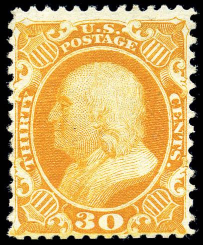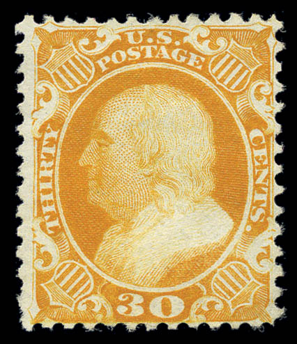 1857-60 (1875 Reprint), 30¢ yellow orange (46), without gum as issued, nicely centered with bright, truly vibrant color, exceptionally fresh and F.-V.F. Scott $3,000