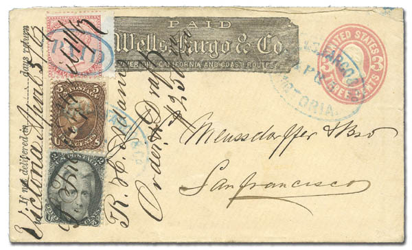 Wells, Fargo & Co., printed frank on 3¢ rose entire (U581) additionally franked with a 3¢ black & 5¢ brown (73, 76), each with some trimmed perforations, and Vancouver Island 5¢ rose (5), to San Francisco; U.S. stamps tied by blue "Wells Fargo & Co., Victoria, April 5" oval datestamp, 5¢ rose cancelled by blue oval "Paid", and all also tied by the neat docketing often characteristic of this Meussdorfercorrespondence; trivial opening tear at upper right, Very Fine. Estimate $2,500 - 3,500