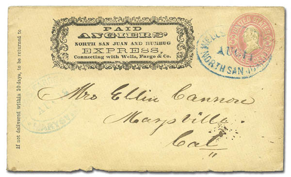 Angiers' North San Juan and Humbug Express, ornate printed frank on 3¢ pink entire (U58) to Marysville with additional "Wells Fargo & Co. North San Juan Aug. 14" blue oval and "Wells Fargo & Co. Marysville Aug. 18" receiving postmark; two small nicks at bottom from opening, still Very Fine conjunctive usage. Angiers operated between Humbug and North San Juan in the Yuba River mining region, "Connecting with Wells, Fargo & Co." as this cover demonstrates and the frank spells out. Estimate $1,000 - 1,500