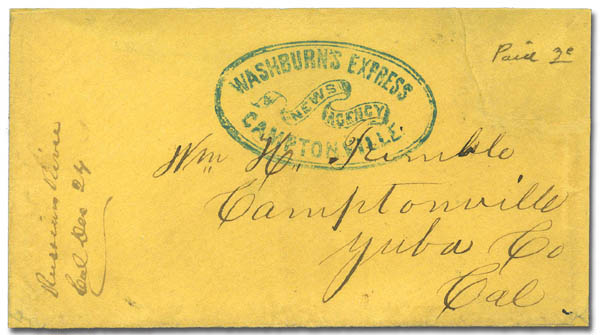 Washburn's Express/ News Agency/ Camptonville, blue oval handstamp with fancy scroll at center, beautifully struck on cover to Camptonville, manuscript. "Russian River/ Cal. Dec. 24" at lower left, upper right corner of cover torn away and repaired with a "Paid 3¢" added by the conservator, and based on a similar cover from the Edwards Collection (Lot 1380), Very Fine appearance & rare. Estimate $750 - 1,000