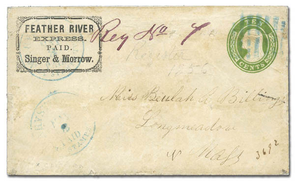 Singer & Morrow's Feather River Express, boxed printed frank on 10¢ green entire (U17) to Longmeadow, Mass. with red manuscript. "Reg. No. 7" at top center, two partial strikes of Marysville Cal. c.d.s. with integral "Paid By Stamps," one struck over frank, matching segmented cork killer over Nesbitt oval, pencil "Register 1856" possibly written by the express agent, though the manuscript. "3692" at lower right is of unknown origin and intent; cover with some tiny edge nicks, wear along horizontal file fold near top discreetly strengthened with small pieces of archival tape, Fine appearance and very rare. Capt. William Singer's partnership in several short-lived express companies all occurred in a tumultuous 7 year period, but this remarkable usage carries some posthumous (and deserving) fame: the combination of early post office registration and small flighty express company is virtually unheard of. Estimate $3,000 - 4,000