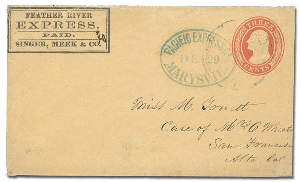Feather River Express./ Paid./ Singer, Meek & Co., boxed printed frank with indistinct manuscript. mark in 3rd line on 3¢ red on buff entire (U10) to San Francisco, blue "Pacific Express Co. Marysville Dec. 29" oval postmark, additional faint c.d.s.; cover refolded at edges, Very Fine appearance, very rare. Singer's partnership with Emerson Meek was his last foray into the express business. Estimate $750 - 1,000