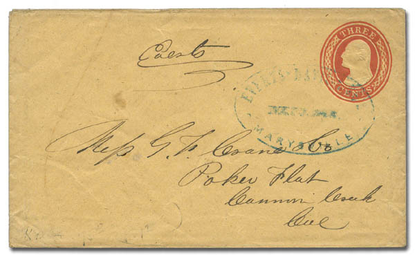 Pacific Express Co., printed Paid frank with woodcut of rider on 3¢ red entire (U9) to Sarah Pellet at Bidwells Bar with blue "Everts, Davis & Co's Express Marysville" oval and "Pacific Express Co. Sacramento Oct. 31" oval datestamp, manuscript. instructions from American Valley requesting forwarding, reverse has notes from Miss Pellet with a list of names to be written to (petition?) incl. "Gov. Foote" (presumably former Miss. Gov. Henry S. who had moved to Cal.) and various judges, Fine & unusual. Estimate $500 - 750