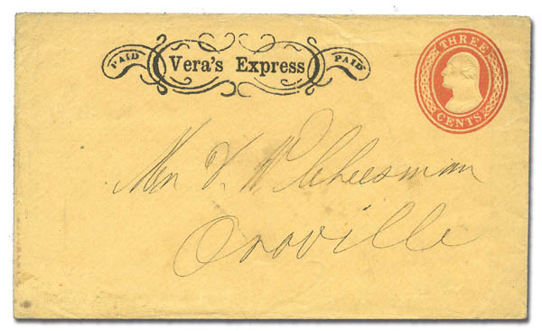Vera's Express, printed frank on 3¢ red on buff entire (U10) to Oroville, Cal., Very Fine, one of the finest examples of this very rare express frank. Ex Dale-Lichtenstein. Estimate $2,000 - 3,000