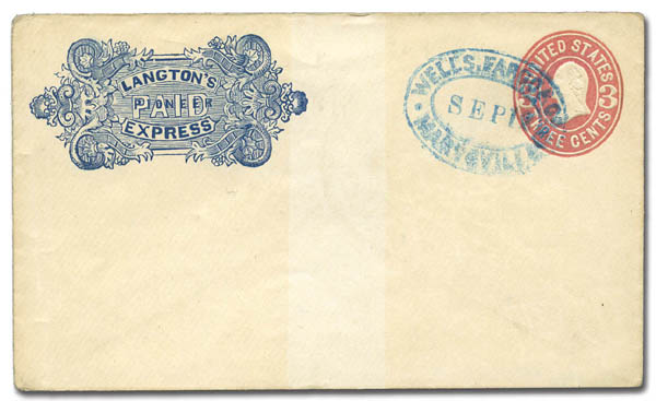 Langton's Pioneer Express, ornate Paid frank in dark blue on unaddressed 3¢ pink entire (U58) with blue "Wells, Fargo & Co. Marysville Sep. 12" double oval, no evidence of this being a paste-up or having an address removed, Very Fine & unusual. Estimate $750 - 1,000