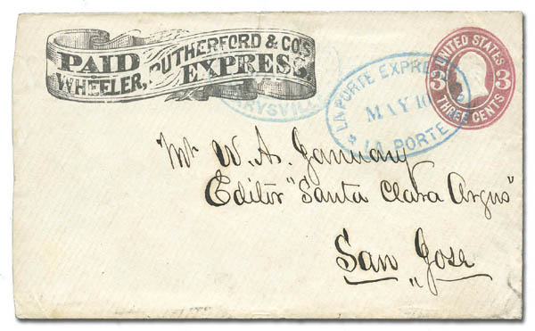 Wheeler, Rutherford & Co's Express, printed frank in banner on 3¢ pink entire (U58) to the editor of the Santa Clara Argus, San Jose with blue "LaPorte Express Co. La Porte May 10" oval and partial Wells Fargo Marysville oval, slightly reduced at left, well clear of frank, Very Fine triple conjunctive use. Estimate $1,500 - 2,000