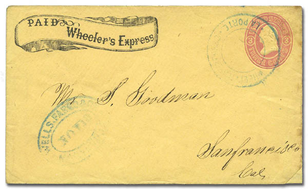 Wheeler's Express, printed frank in scroll on 3¢ pink on buff entire (U35) to San Francisco, blue "Wheeler's Express La Porte" double circle and partial Wells Fargo & Co. Marysville struck at lower left, mended corner nick at BR otherwise Very Fine. The banner-style frank was actually an altered version of the earlier Holland & Wheeler Express woodcut, made when Sam Wheeler dissolved his partnership with Holland in Dec. 1863 and started his own express company in short-lived partnership with his own brother. Estimate $750 - 1,000