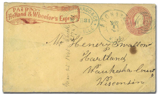 Holland & Wheeler's Express, red printed frank in banner on 3¢ pink on buff entire U35) to Hartland, Wis., "Atchison Kas. May 11 '65" postmark. & target duplex, blue "Wells Fargo & Co. Marysville Mar. 31" oval; cover with small edge flaws and sealed tear at top into frank, Fine. Estimate $750 - 1,000