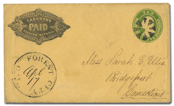 Langton's Pioneer Express, Paid printed frank on 10¢ green on buff entire (U18) to Bridgeport, Ct., entering the mails at Forest City Cal. with clear double line circle and manuscript. date, neat circle of wedges applied over indicia, Very Fine, scarce and attractive combination of express service and post office mails. Estimate $400 - 500