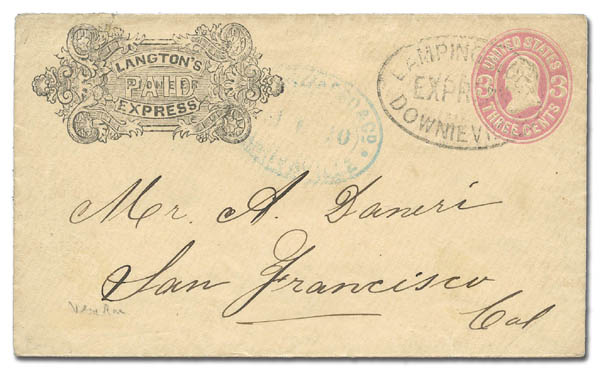 Langton's Pioneer Express, Paid printed frank on 3¢ pink entire (U34) used to Brooklyn, Cal. with large blue Langton's Downieville oval, blue "Wells Fargo & Co. Marysville May 31" double-oval datestamp and black oval "J. Bamber & Co. Contra Costa Express San Francisco," slightly reduced at top and small sealed tear above W.F. oval, Fine, rare triple express usage. Estimate $1,000 - 1,500