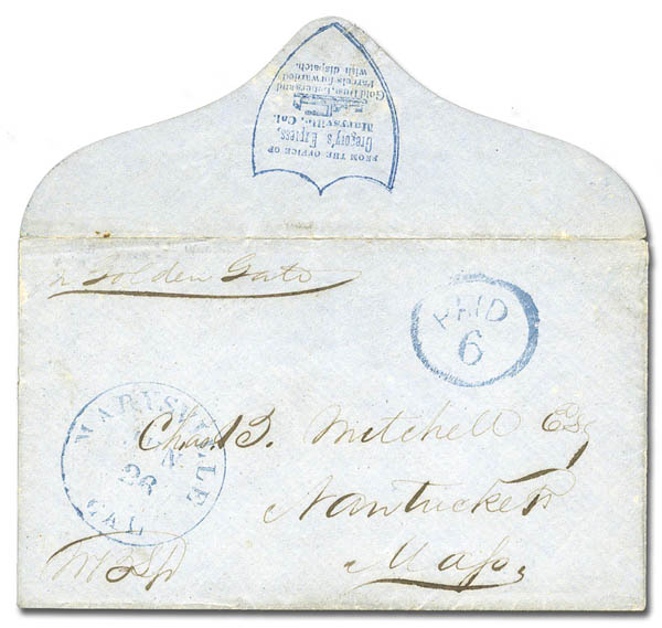 From the Office of Gregory's Express, Marysville, Cal. Gold Dust, Letters and Parcels forwarded with dispatch, shield handstamp in blue, with small vignette of steamboat, on flap of cover to Nantucket, Mass. "pr. Golden Gate" with blue "Marysville Cal. Jun. 26" c.d.s. and "Paid 6" in irregular oval, sealed tear into shield, still Very Fine, very rare. Estimate $750 - 1,000