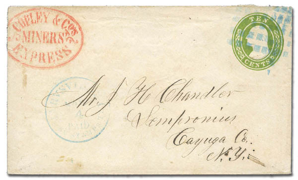 Copley & Co's Miners Express, red oval with ornaments, clear strike on 10¢ green entire (U17a) to Sempronius, N.Y. with blue "Marysville Cal. Paid By Stamps Nov. 4" c.d.s and matching large grid of squares, tiny tear at upper left, just touching "E" of "Express,", Very Fine, colorful example of this short-lived company. Estimate $2,000 - 3,000