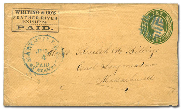 Whiting & Co's Feather River Express, Paid printed frank on 10¢ green on buff entire (U16) to East Longmeadow, Mass., blue "Marysville Cal. Paid By Stamps Jul. 4" c.d.s. with matching ornate crossroads cancel on 10¢, small tear at top, Very Fine & attractive. Estimate $750 - 1,000