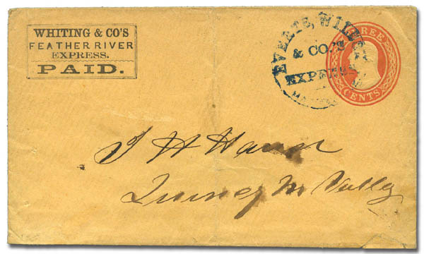Whiting & Co's Feather River Express, printed Paid frank in box on 3¢ red on buff entire (U10) to Quincy Valley, blue "Everts, Wilson & Co's Express Marysville" circle handstamp, vertical file fold at center, Fine. Though both express companies served the same area, Everts and Whiting were friends. According to Nathan, Whiting made arrangements to turn over a portion of the route (Quincy-Marysville) to Everts. Estimate $750 - 1,000