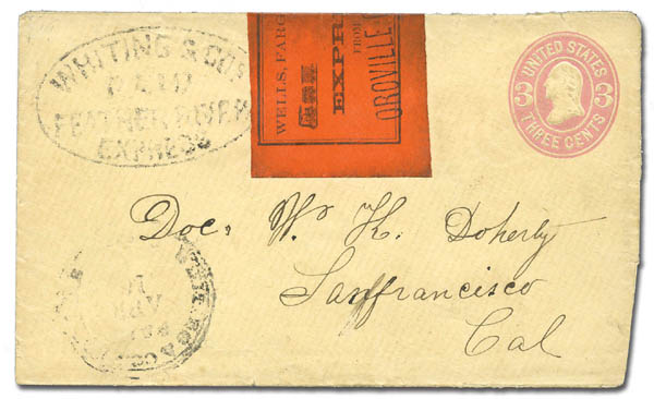 Whiting & Co's Feather River Express, mostly clear oval on 3¢ pink on buff entire (U59) to San Francisco with Whiting & Co's Express Quincy Paid Apr. 16 double line circle and "Wells Fargo & Co's Express Oroville Cal." orange label with town name struck on pasted over top, opened at R. with small reduction at BR, o/w fresh, Fine and rare combination of markings and label. Estimate $1,000 - 1,500