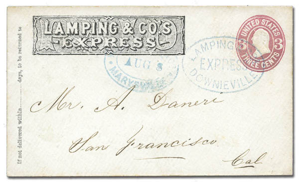 Lamping & Co's Express, Paid printed frank on 3¢ pink entire (U58) entire to San Francisco, neat "Laming & Co's Express Downieville" used in combination with blue "Wells Fargo & Co. Marysville Aug. 8" double oval datestamp, Very Fine and choice. Estimate $1,000 - 1,500