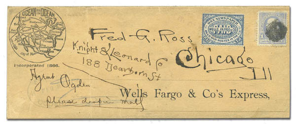 Wells Fargo & Co., Newspaper (Unstated Value), Blue (143LP9), appears uncanceled but struck and tied by faint violet straightline cancel on rebacked wrapper with part-printed address to Ogden agent of Wells Fargo for delivery by regular mail to Chicago, and additionally franked by 1¢ ultramarine (246) tied by cork cancel, manuscript. "Agent Ogden please drop in mail", faint "Wells Fargo & Co. Odgen Utah Feb. 22, 1895" oval in violet, express map corner card, Very Fine appearance, great commercial rarity showing newspaper & regular postage combination. Estimate $1,500 - 2,000