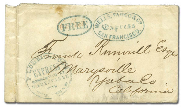 F. Rumrill & Co's Express Connecting At Marysville with Wells Fargo & Co., blue circle handstamp on cover to Frank Rumrill at Marysville, carried privately to Wells Fargo at San Francisco, bold oval "FREE" struck over red "Collect" script handstamp, original enclosure datelined "Franklin (O.) Sept. 14, 1854", cover folded at left and some wear, Fine and rare. Estimate $1,000 - 1,500