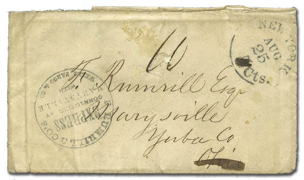 F. Rumrill & Co's Express Connecting At Marysville with Wells Fargo & Co., well struck circle in black, on cover to Frank Rumrill at Marysville with "New York Aug. 25 5 Cts." with "5" crossed out and large "10" written at center, incorrectly addressed to Ohio, which was struck out, probably by sender, original 1854 Franklin, O. enclosure from Rumrill's lover, Henrietta, who is glad that express co. business is picking up, wonders if Frank's mother will consent to their marriage ("Is she willing that I should partially rob her of her Frank?"), etc.; cover with some soiling, Fine & rare. Estimate $1,000 - 1,500
