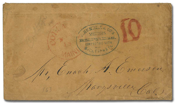F. Rumrill &Co's Northern Express. Connecting With Wells, Fargo & Co., blue double line oval struck at center of buff cover to Marysville with large crude "10" in red and matching Maine c.d.s. with not quite readable town, Fine & rare. Estimate $750 - 1,000