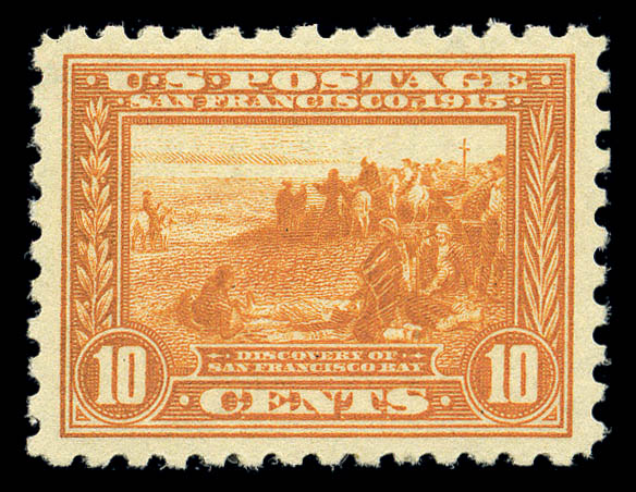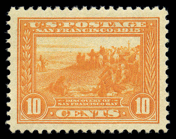 1915, 10¢ Panama-Pacific, perf 10 (404), centered with mathematical precision within large margins, full even perforations all around, deep rich color, fresh never hinged original gum, Superb. SMQ $12,000. Scott $1,750