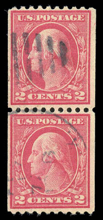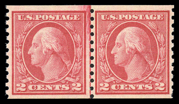 o 1915, 2¢ red, type I, rotary coil (449), a fresh, exceptionally well centered pair with vibrant color and a light duplex cancel, Very Fine and choice. Scott $5,250