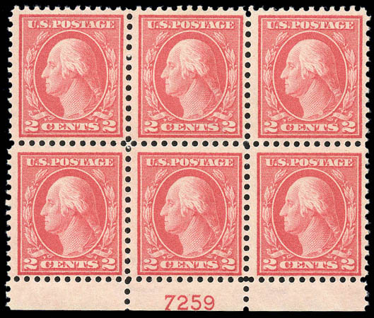 1915, 2¢ pale carmine red, SL watermark, perf 11 (461), bottom margin plate no. block of six, wonderfully bright and fresh with solid perforations and lightly hinged original gum (5 stamps never hinged), F.-V.F. Scott $1,500