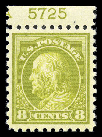 1914, 8¢ pale olive green (431), plate number single, virtually perfectly centered with large balanced margins and pristine, never hinged original gum, a choice, Extremely Fine gem. SMQ $750. Scott $83