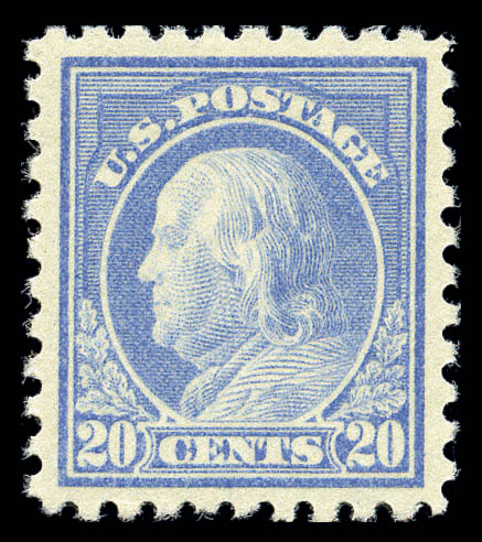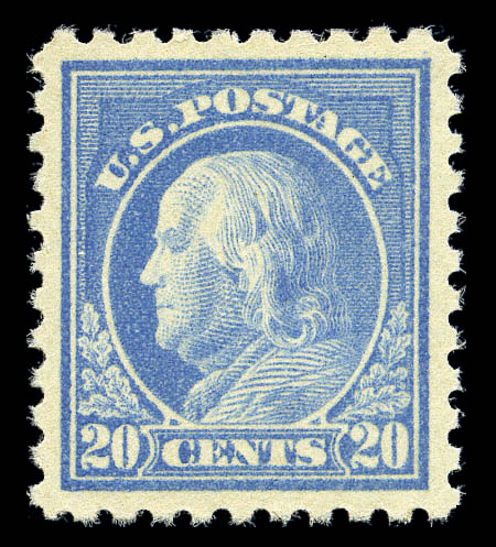 1914, 20¢ ultramarine (438), perfectly centered with large margins and absolutely brilliant color, original gum, never hinged; a post office fresh, Extremely Fine gem. SMQ $2,200. Scott $460