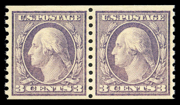 1916, 3¢ violet, rotary coil (456), pair, exceptionally fresh and and beautifully centered with barely hinged original gum, Extremely Fine and choice. SMQ $1,900. Scott $600
