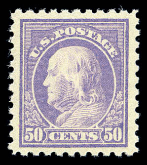 1915, 50¢ violet (440), well centered with large margins and bright pastel color, original gum, never hinged with a tiny natural gum skip, fresh and Very Fine. Scott $1,175