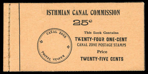 BK Canal Zone, 1909, 2c vermilion & black, error booklet (32c), four vertical format panes, stitched at top, salmon style B covers intended for the 25¢ booklet of four 1¢ panes, two with virtually full perforations, two a bit trimmed, original gum, interleaving adherence, Very Fine and rare. Scott $3,500 for the 2¢ panes alone. CZSG 32c.6. Estimate $750 - 1,000