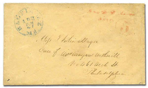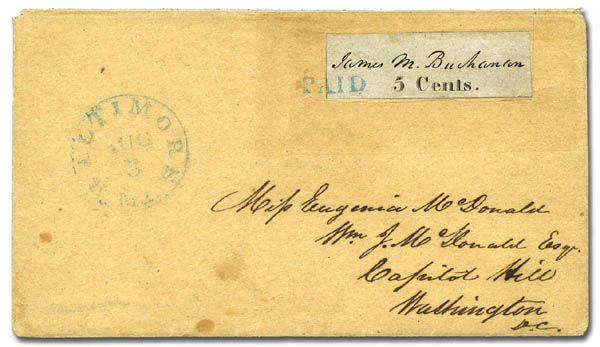 THE EARLIEST DOCUMENTED USE OF THE FIVE-CENT BALTIMORE PROVISIONAL ON BLUISH PAPER.