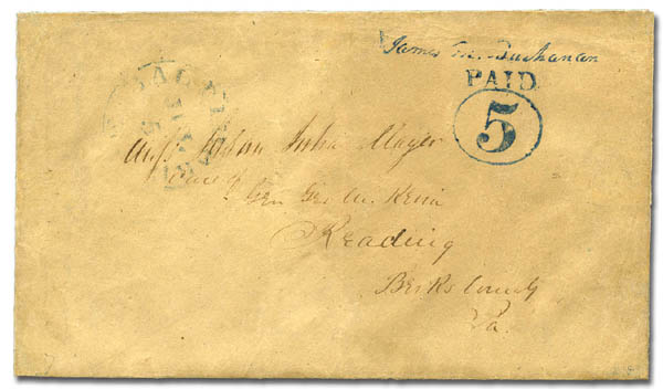 Baltimore, Md., 5¢ blue entire (3XU1), nicely struck on buff envelope to Reading Pa. with blue "Baltimore Md. Jul 5" c.d.s.; some professional restoration including top flap re-attached; handsome, Very Fine appearance. Scott $6,500
