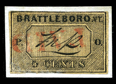 o Brattleboro, Vt., 1846, 5¢ black on buff (5X1), position 6, large margins except just touching top and bottom center framelines, affixed to small piece, canceled neat red "Paid" straightline, small repair at lower left, Fine appearance. Scott $10,000
