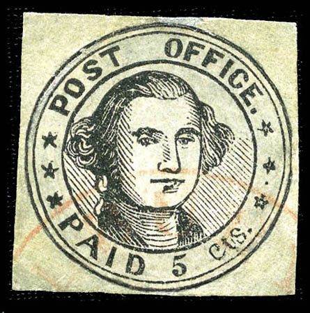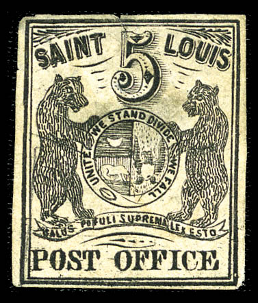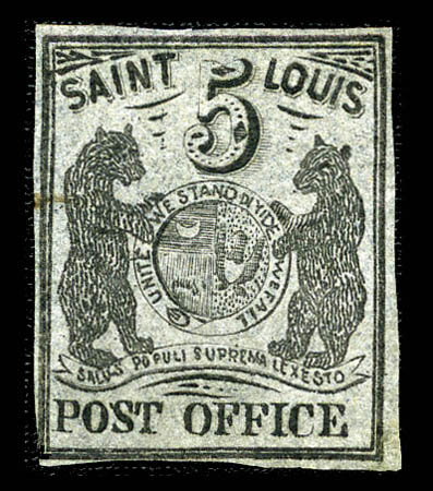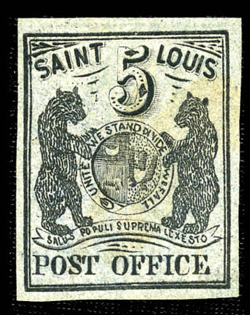 ( ) St. Louis, Mo., 1845, 5¢ black on greenish (11X1), type I, position 1, four even margins, unused without gum, unobtrusive faults, Very Fine appearance. Scott $50,000