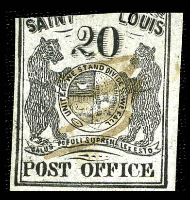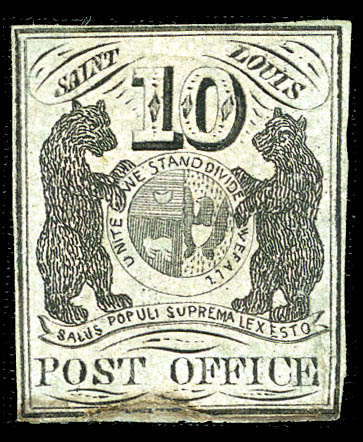 ( ) St. Louis, Mo., 1845, 10¢ black on greenish (11X2), type III, position 6, mostly clear margins, unused without gum, small piece added at bottom (and toned) with 3/8-inch sealed tear at lower right, otherwise Fine. Scott $50,000