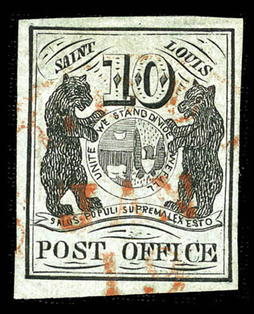 o St. Louis, Mo., 1845, 10¢ black on greenish, offset impression on reverse (11X2 var.), type II, position 4, exceptionally fresh and bright with large to oversized margins, canceled solely by red Jan 19 St. Louis c.d.s., strong inverted offset impression showing parts of four stamps (positions 3-4/5-6); minor light thin spot; choice, Extremely Fine appearance. Scott $8,000+