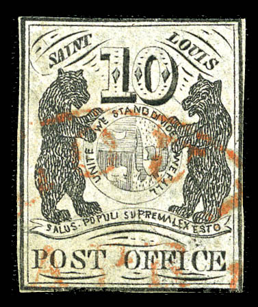 o St. Louis, Mo., 1846, 10¢ black on gray lilac (11X5), type I, position 3, small margins to just touching, neatly canceled soley by red St. Louis c.d.s.; miniscule corner crease at lower right (not mentioned on accompanying certificate), Fine and quite attractive. Scott $8,000