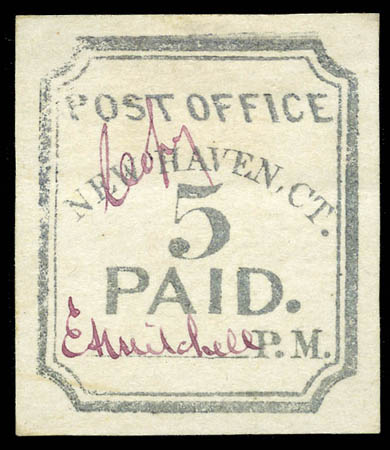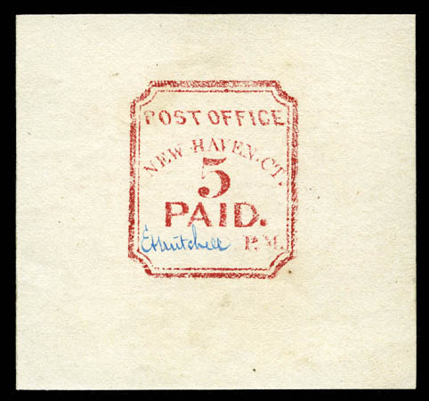 New Haven, Ct., 1845 (1874 reprint), 5¢ carmine (8XU4 var), cut square, signed by Postmaster Mitchell in blue, Very Fine. Only thirty 1874 reprints were produced. Scott $1,200