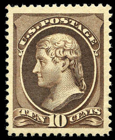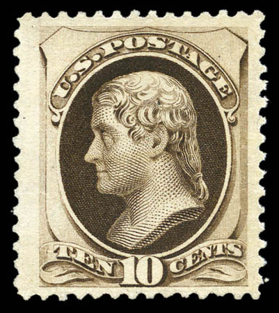 1882, 10¢ black brown, re-engraved (209b), a phenomenal mint single featuring choice, virtually perfect centering, enormous, beautifully balanced margins, a razor-sharp, prooflike impression and full, lightly hinged original gum; marvelously fresh and Extremely Fine to Superb. SMQ $7,200 for a normal 95. Scott $475