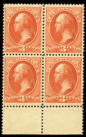 1887, 3¢ vermilion (214), bottom sheet margin block of four, beautifully centered with absolutely brilliant color and pristine, never hinged original gum, Extremely Fine and choice. Scott $800 as singles